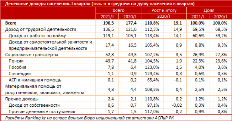 Более двух третей денежных доходов населения в первом квартале 2021 года пришлось на доходы от трудовой деятельности: 136,5 тысячи тенге, из которых 119,1 тысячи тенге - от работы по найму, 17,4 тысячи тенге - от самостоятельной занятости и предпринимательской деятельности.