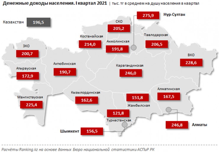 Среди регионов Казахстана наибольшие денежные доходы традиционно зафиксированы в мегаполисах - Нур-Султане (275,9 тысячи тенге) и Алматы (246,8 тысячи тенге). Незначительно уступила Алматы Карагандинская область с показателем в 246 тысяч тенге в среднем на душу населения за первый квартал 2021 года.