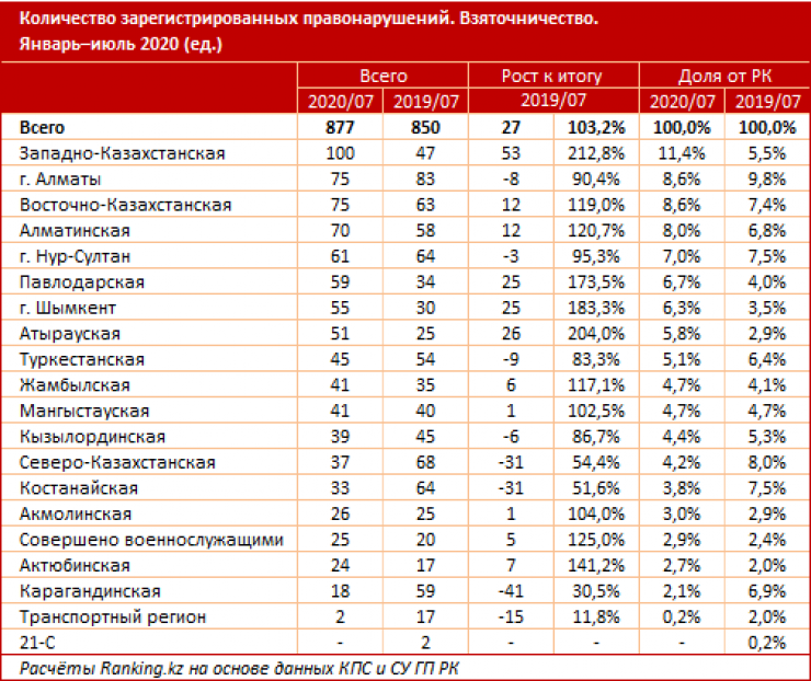 По итогам семи месяцев наибольшее количество правонарушений в сфере взяточничества пришлось на Западно-Казахстанскую область - 100 случаев, это в 2,1 раза больше, чем годом ранее. В тройку печального первенства также вошли Алматы и Восточно-Казахстанская область: по 75 зарегистрированных правонарушений в каждом из регионов.