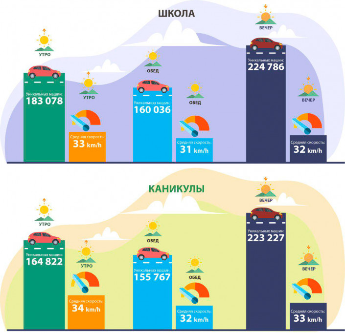 Специалисты подсчитали, что более 20 тысяч водителей в городе растягивают час пик до двух часов, перевозя школьников. Отмечается, что во время каникул этот период дня длится лишь 20-30 минут. По словам создателей системы "Сергек", летним утром на столичные улицы выезжает 150-160 тысяч авто. С началом учебных занятий их количество возрастает до 180 тысяч.