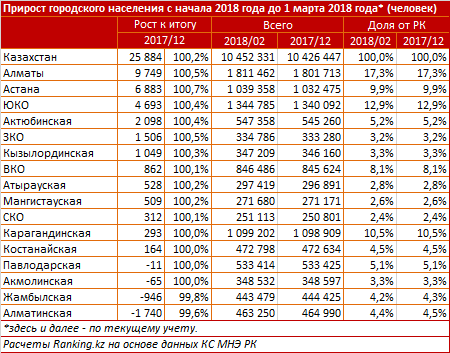 Прирост городского населения за первые два месяца текущего года составил 25,9 тысячи человек, (0,2 процента) - до 10,45 миллиона. Увеличение количества горожан отмечено был в 12 из 16 регионов РК.