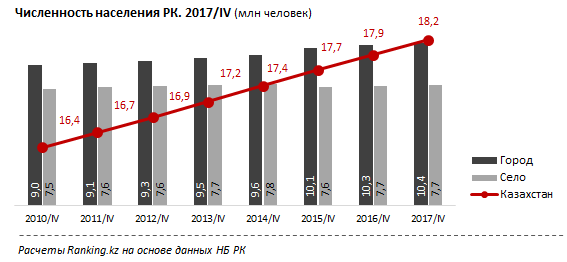 К концу 2017 года в РК проживало 18,16 миллиона казахстанцев - на 1,3 процента (238,9 тысячи человек) больше, чем годом ранее. Для сравнения, в 2016-м годовой рост составлял 1,4 процента (247,3 тысячи человек).