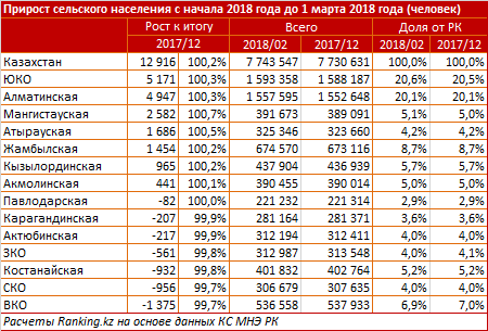 Численность жителей на селе выросла только в семи областях из 14 по РК.
