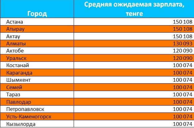 Специалисты HeadHunter также изучили размеры окладов, которые указывали в своих резюме соискатели разных регионов Казахстана, и вывели средние значения по крупным городам. На максимальную (среди средних) заработную плату в 150 108 тенге претендуют жители Астаны, Атырау и Актау. Немногим отстают алматинцы, желающие получать в среднем 130 093 тенге. На третьем месте разместились - Актобе и Уральск с желаемым окладом в 120 090 тенге. Примерная зарплата специалистов других исследуемых городов (Костанай, Караганда, Шымкент, Семей, Тараз, Павлодар, Петропавловск, Усть-Каменогорск и Кызылорда) составляет 100 074 тенге.