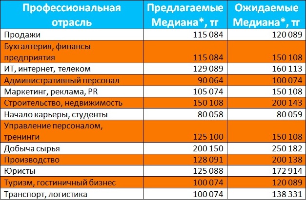 Наименьшее значение средней заработной платы, указанное в вакансиях сайта, пришлось на профессиональные области: начало карьеры, студенты (80 058 тенге), административный персонал (90 064 тенге), туризм и гостиничный бизнес, а также транспорт и логистика (100 074 тенге).