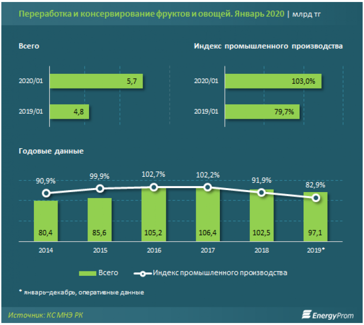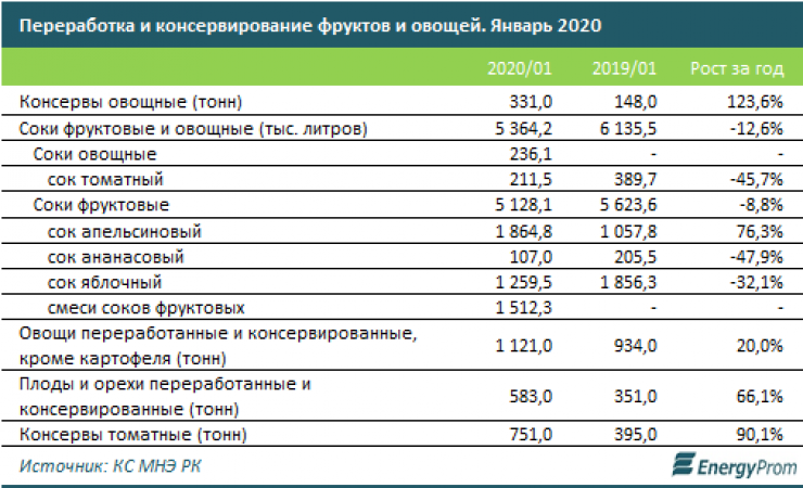 В целом за январь 2020 года казахстанские компании переработали и законсервировали фруктов и овощей на сумму 5,7 миллиарда тенге - на три процента больше (с учетом инфляции), чем в январе прошлого года.