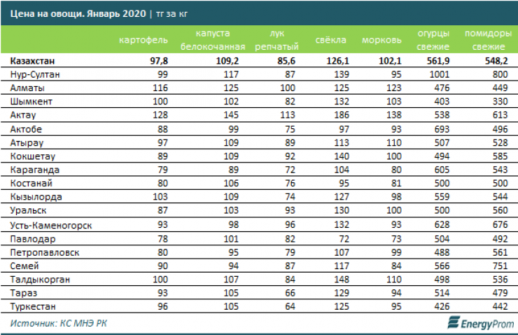 Цены на овощи проанализированы за январь 2020 года. По данным аналитиков, в магазинах и на базарах городов страны подорожали картофель (на 13,3 процента за год), репчатый лук (на 9,8 процента к январю 2019 года), морковь (на 4,8 процента), белокочанная капуста (на 2,7 процента). Свежие огурцы и помидоры стоили меньше, чем годом ранее (на 9,7 процента и 9,5 процента, соответственно), как и свекла (на 2,2 процента).