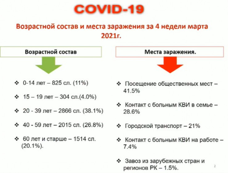 На третьем месте среди мест заражения - городской транспорт. Здесь выявлен 21 процент от числа заболевших. 7,4 процента подцепили инфекцию на работе. 1,5 процента случаев - завоз из зарубежных стран и регионов Казахстана.
