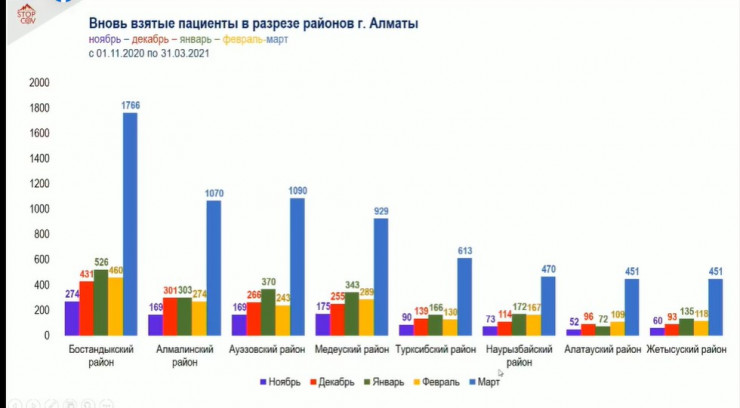 Руководитель Центра телемедицины Лаура Мырзагали также предоставила статистику по заболеваемости коронавирусом в районах города. На первом месте по числу заболевших находится Бостандыкский район. Здесь в марте 1766 случаев. Затем идут Алмалинский, Ауэзовский и Медеуский районы, в каждом около тысячи заболеваний за месяц. Меньше всего выявлено в Жетысуском и Алатауском районах - по 451 случаю.