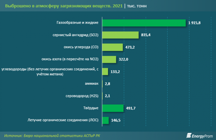 За 2021 год общий объем выбросов от всех стационарных источников загрязнения в Казахстане составил 34,3 миллиона тонн, что на 3,3 процента меньше, чем в 2020 году. Уловлено и обезврежено 31,9 миллиона тонн выбросов. Объем выбросов загрязняющих веществ в атмосферный воздух в 2021 году составил 2,4 миллиона тонн, на 1,4 процента меньше по сравнению с 2020 годом.
