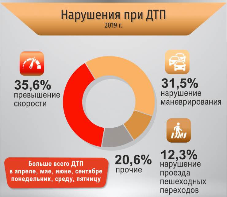 Более трети всех зафиксированных нарушений - это превышение скорости, установленной ПДД или дорожными знаками. Еще треть ДТП произошла по причине нарушения маневрирования. Часть аварий произошла из-за нарушения проезда пешеходных переходов.