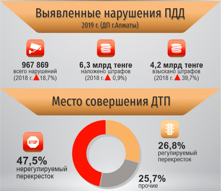 Всего в 2019 году выявлено 968 тысяч нарушений Правил дорожного движения. Это на 18,7 процента больше, чем годом ранее (815 тысяч). Наложено штрафов на сумму 6,3 миллиарда тенге.