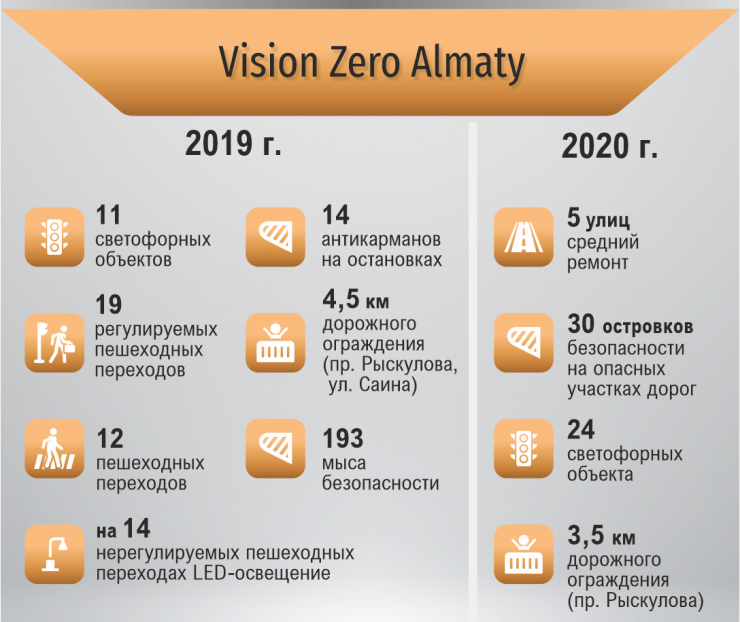 "Для снижения количества ДТП в рамках плана действий VisionZeroAlmaty построены регулируемые пешеходные переходы и светофорные объекты, антикарманы на остановках, мысы безопасности, нерегулируемые пешеходные переходы оснащены LЕD-освещением и другое.