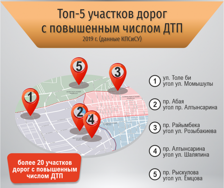 А в Алмалинском районе самая высокая плотность дорог. При этом район находится на втором месте после Ауэзовского по плотности населения, с высокой концентрацией офисных, торговых и других коммерческих помещений. Этот район занимает 2-е место по количеству аварий.