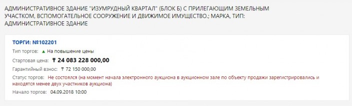 Начало торгов было запланировано на 10.00 часов 4 сентября. Как отмечается на электронной торговой площадке gosreestr.kz, на момент начала аукциона в аукционном зале по объекту продажи зарегистрировались и находились менее двух участников. Торги не состоялись.