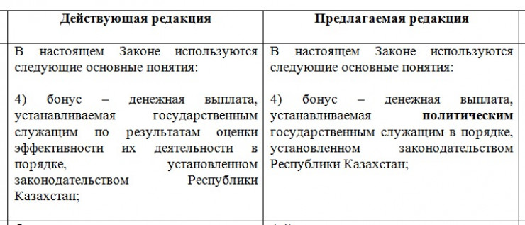 В соответствии с пунктом 1 Дорожной карты по реализации Плана нации "100 конкретных шагов" разработан законопроект, предусматривающий внесение изменений и дополнений в закон "О государственной службе Республики Казахстан" в части исключения начисления бонусов административным государственным служащим", - говорится в пояснительной записке.