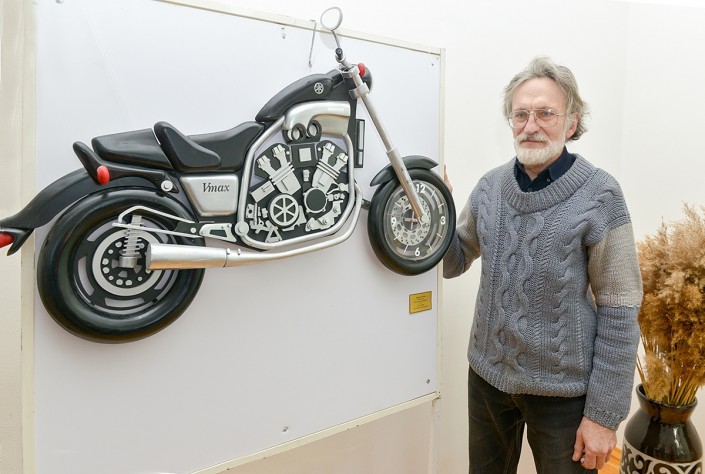 Изюминка выставки - легендарный мотоцикл "Харли Дэвидсон", давно ставший символом байк-движения. Транспортное средство сделано вручную. Автор согласился выставить его на условиях анонимности. Также в музее-заповеднике экспонируются работы, выполненные в технике лазерной резки фанеры.