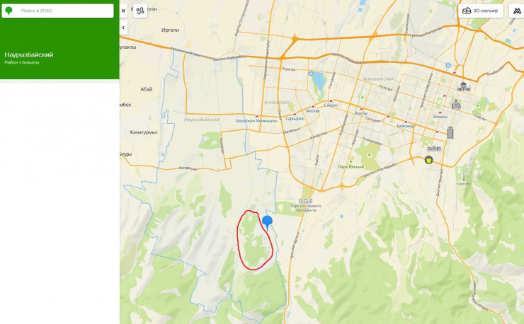 Карта Алматы: голубым выделена территория Наурызбайского района, а красным - примерные границы 96 гектаров земли в микрорайоне Карагайлы