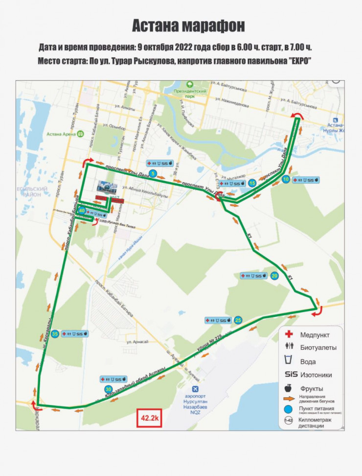 "9 октября в период с 07:00 до 13:00 в столице запланировано проведение ежегодного международного марафона Astana Marathon 2022, при котором движение транспортных средств на некоторых участках улиц города будет временно ограничено.