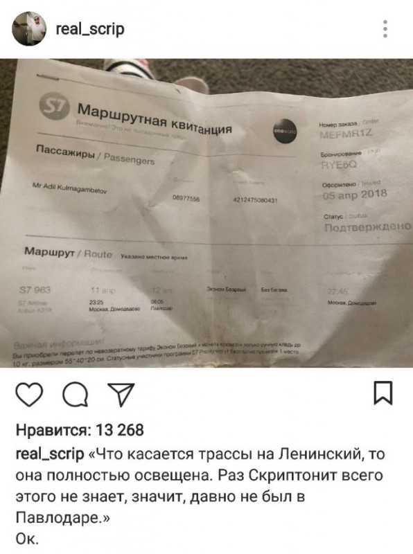 Также артист опубликовал скриншот письма, датированного 22 апреля, и фотографию авиабилета из Москвы в Павлодар, тем самым ответив на заявление акимата, что "Скриптонит, наверное, давно не был в родном городе".