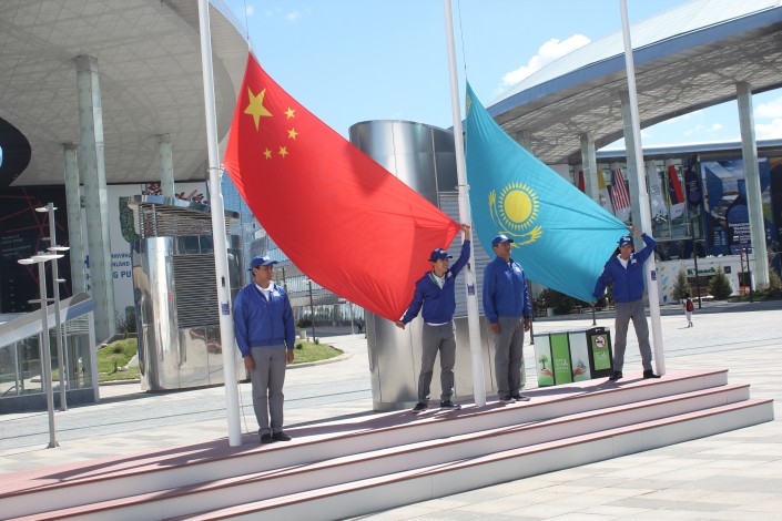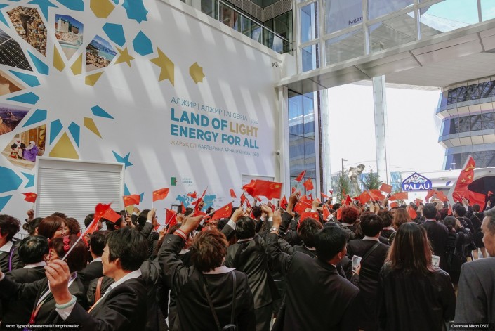 На специализированной выставке отмечают Национальный день Китая, который на сегодня имеет один из самых посещаемых павильонов на EXPO-2017. Под звуки гимнов волонтеры выставки торжественно подняли флаг КНР у сцены Национального дня, где делегаты Китая и Казахстана поздравляли друг друга.