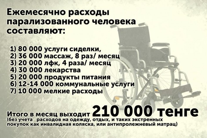 Итого в месяц расходов выходит 210 000 тенге (без учета затрат на одежду, отдых, и таких экстренных покупок как инвалидная коляска, или антипролежневый матрац).