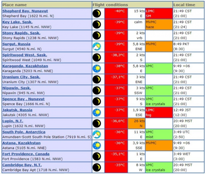 Первые три позиции в списке самых холодных мест мира разделили залив Шеперд (Канада), Ки-Лейк (Канада) и Стоуни Рапидс (Канада). Караганда расположилась на шестом месте с минус 38 градусами мороза. Столица Казахстана оказалась на 13-м месте. В Астане температура воздуха опустилась до минус 36 градусов. Замыкает топ-15 самых холодных мест мира Кеймбридж-Бей в Северной Каролине, США.
