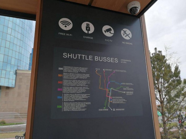 "Остановка делится на три сектора. Открытый зал ожидания. Здесь пользователи смогут ознакомиться с расписанием, маршрутами и остановками транспорта. Из плюсов: свободный Wi-Fi (процесс тестирования), разъемы для зарядки телефонов, круглосуточное видеонаблюдение. Также есть закрытый зал ожидания. Будет пользоваться большим спросом как в зимние морозы, так и в летний зной. Оборудован системой кондиционирования и обогрева, расписаниями маршрутов и остановки! Третий сектор рассчитан под торговлю, минимаркет. Это будет очень удобно для дальнейшего развития малого и среднего бизнеса!" - написал Арман Турлубек.