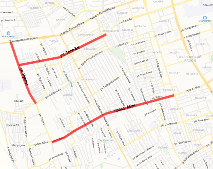 На сайте государственных закупок сообщается о пробивке магистральной улицы районного значения № 1 (МУРЗ №1) за 1,5 миллиарда тенге. Строительство начнется от улицы Жубанова и протянется до проспекта Райымбека. По данным акимата, эта улица на карте обозначена под названием Нурлы, пересекается с пробивкой проспекта Абая. Кроме того, вдоль нее расположен аппарат акима Наурызбайского района.