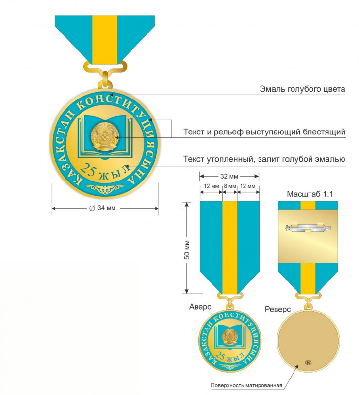 "В целях поощрения граждан Республики Казахстан и иностранных граждан, внесших значительный вклад в обеспечение верховенства Конституции, становление и развитие конституционных основ Республики Казахстан, защиту конституционных прав и свобод человека и гражданина, а также в ознаменование 25-летия Конституции Республики Казахстан постановляю: учредить юбилейную медаль "Қазақстан Конституциясына 25 жыл", утвердить прилагаемые правила награждения юбилейной медалью "Қазақстан Конституциясына 25 жыл", описание юбилейной медали "Қазақстан Конституциясына 25 жыл". Настоящий указ вводится в действие со дня его подписания", - говорится в официальном сообщении.
