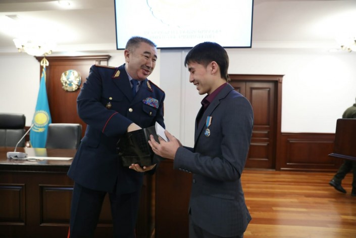 Министр внутренних дел Ерлан Тургумбаев наградил десятиклассника Надира Омаргазиева, который спас упавшего в колодец ребенка, передает корреспондент Tengrinews.kz.