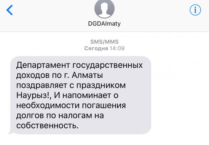 Напомним, в преддверии праздника казахстанцы получили сообщения на мобильные телефоны со следующим текстом: "Департамент государственных доходов по Алматы поздравляет с праздником Наурыз! И напоминает о необходимости погашения долгов по налогам на собственность".