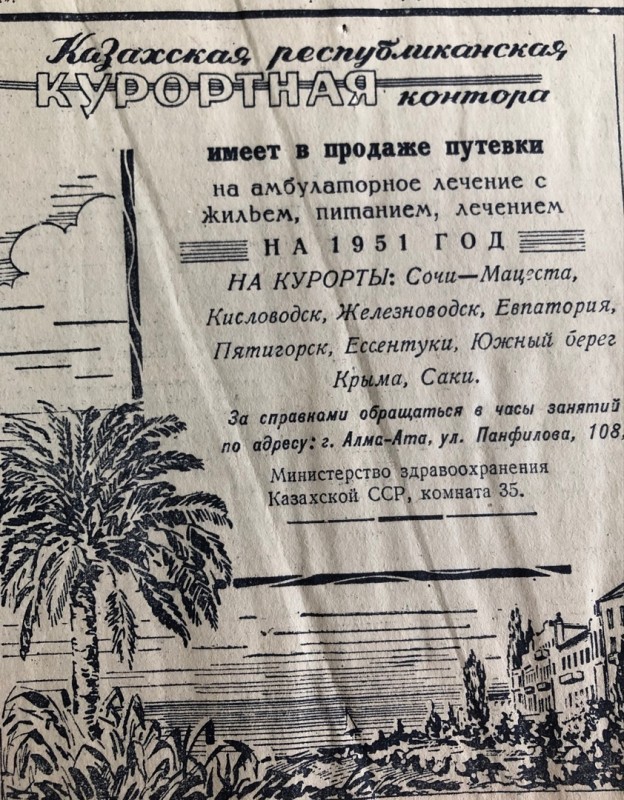 Рекламы в СМИ того периода почти не было. Однако "двигатель торговли" нет-нет да и проскальзывал на страницах издания. Так, в канун 1951 года в газете было размещено объявление о продаже путевок  на курорты в Сочи, Кисловодск, Железноводск, Евпаторию, Пятигорск, Ессентуки, Южный берег Крыма и в Саки "на амбулаторное лечение с жильем и питанием".