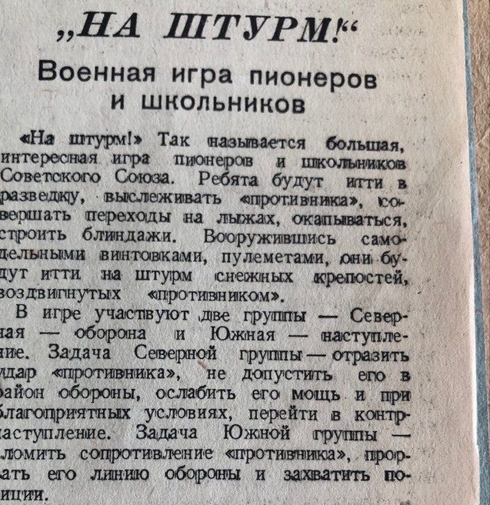 В те годы была актуальной военная тематика. В преддверии нового, 1941 года школьники и пионеры строили блиндажи, ходили в разведку и брали "штурмом" крепости условных противников.