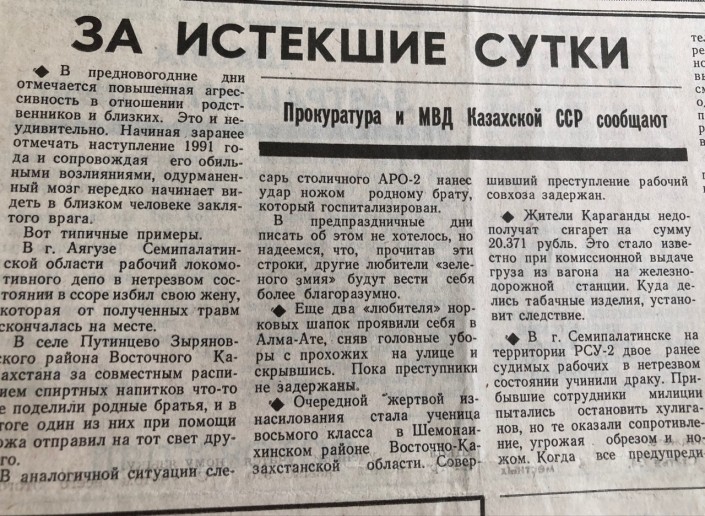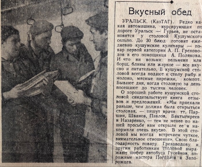 В новогоднем выпуске "Казахстанской правды", который вышел в субботу 31 декабря 1960 года, есть заметка о столовой, расположенной на дороге Уральск-Гурьев. В общепите "что ни возьми: пельмени или борщ, блины или жаркое - все вкусно и питательно".