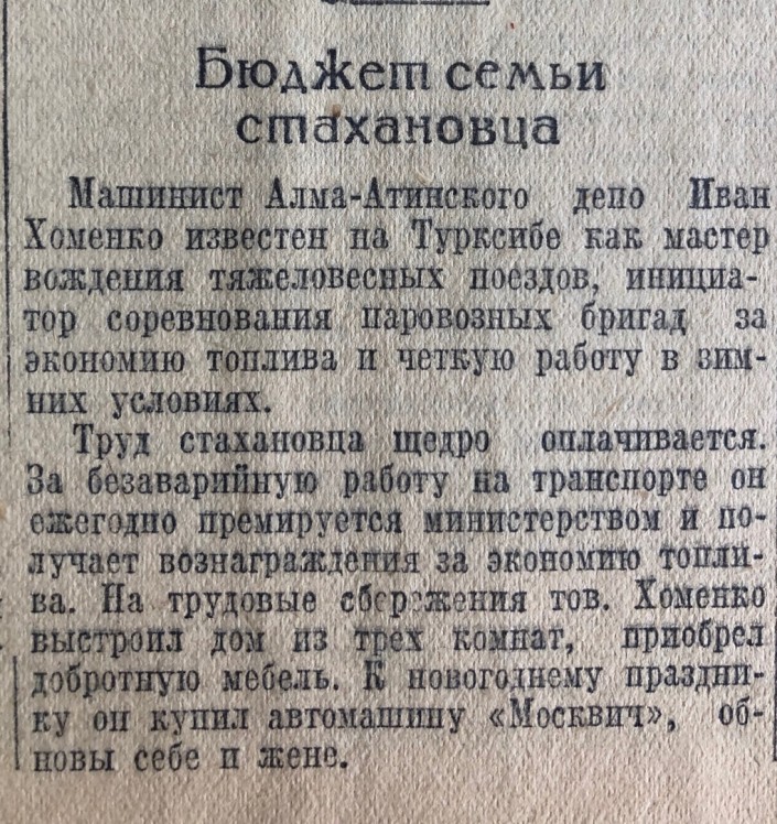 Нередко публиковались истории рядовых советских граждан, которые, благодаря упорному труду и "стахановским" темпам работы, должны были служить примером для остальных. Так, в новогоднем выпуске в 1950 году писали о машинисте Алма-Атинского депо Иване Хоменко, который получил премию от государства за экономию топлива на производстве. На заработанные и сэкономленные деньги "стахановец" отстроил трехкомнатный дом, обставил его мебелью. Кроме того, "к новогоднему празднику он купил автомашину "Москвич", обновы себе и жене".