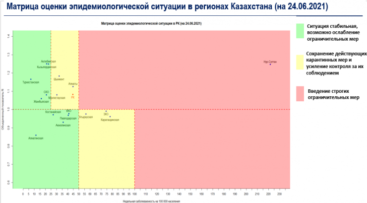 Согласно матрице оценки эпидемиологической ситуации в регионах Казахстана на 24 июня, в "красной" зоне находится Нур-Султан.