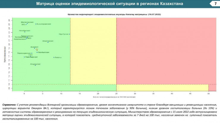 Нур-Султан приблизился к "желтой" зоне, передает Tengrinews.kz со ссылкой на матрицу оценки эпидемиологической ситуации в регионах Казахстана на 16 июля 2022 года.