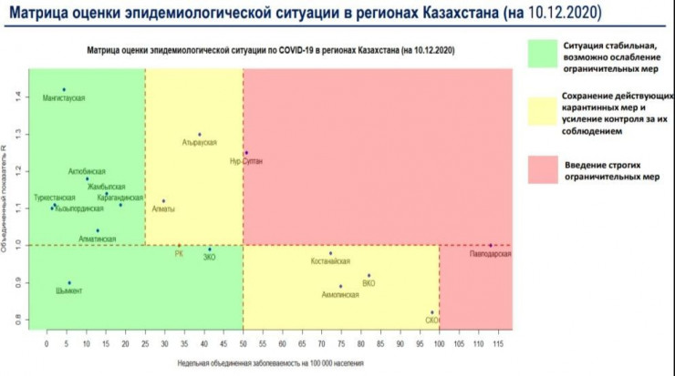 По данным Министерства здравоохранения на 10 декабря, в "красной" зоне находятся Нур-Султан и Павлодарская область. В "желтой" зоне: Восточно-Казахстанская, Атырауская, Костанайская, Акмолинская, Северо-Казахстанская области и город Алматы. Все остальные регионы находятся в "зеленой" зоне.