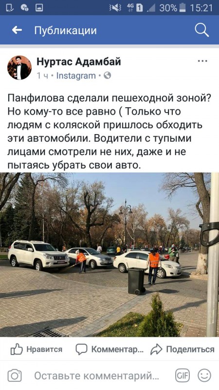 "Панфилова сделали пешеходной зоной? Но кому-то все равно. Только что людям с коляской пришлось обходить эти автомобили. Водители с тупыми лицами смотрели не них, даже и не пытаясь убрать свои авто", - написал Адамбай на своей странице в Facebook, приложив фото.