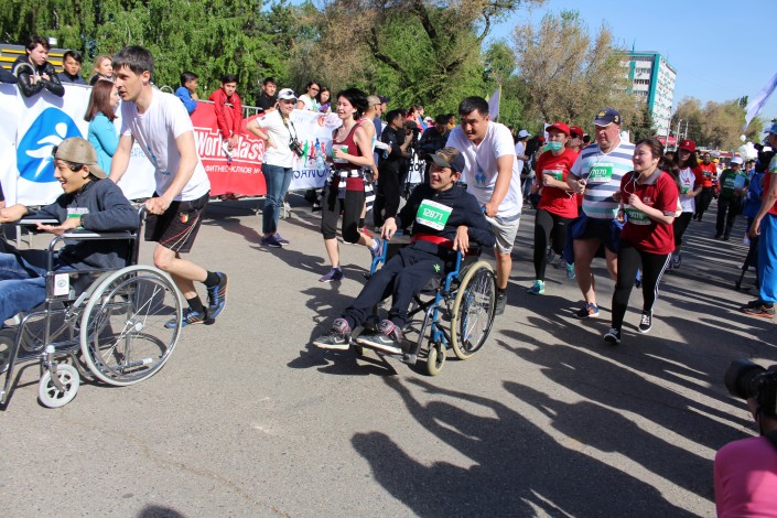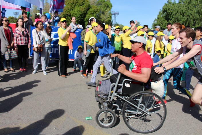 Кроме того, специального приза удостоен марафонец Балтабай Султанов. Мужчина преодолел дистанцию 10 километров на инвалидной коляске. "Я второй раз участвую в марафоне. Сложности были при подъеме, но ребята марафонцы помогли. Этим я хотел сказать, чтобы люди ценили свое здоровье. Я хотел сказать, что человек на инвалидной коляске может быть равным со всеми", - сказал Султанов.