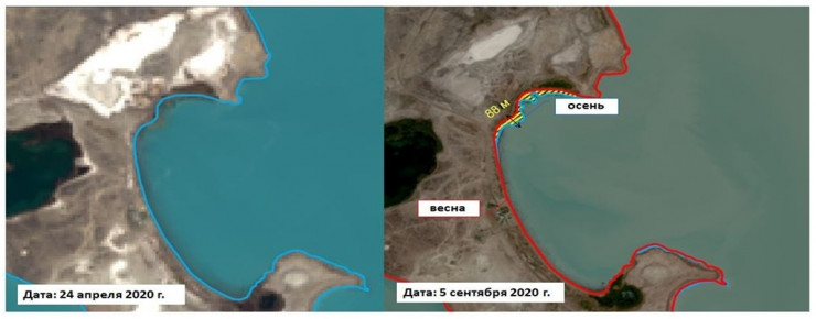 "Весной сток весеннего половодья рек, впадающих в Балхаш, приносит значительную часть речного питания озера. На рисунке ниже отчетливо прослеживается изменение береговой линии по сезонам. Разница в наступлении берега весной составляет 88 метров", - добавили в ведомстве.