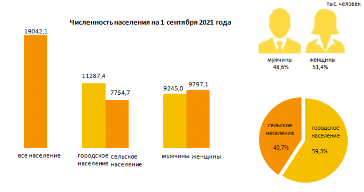 "Численность населения страны на 1 сентября 2021 года составила 19 миллионов 42,1 тысячи человек, в том числе городского - 11 миллионов 287,4 тысячи (59,3 процента), сельского - 7 миллионов 754,7 тысячи - 40,7 процента человек. По сравнению с 1 сентября 2020 года численность населения увеличилась на 257,1 тысячи человек, или 1,4 процента", - сообщили в ведомстве.