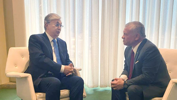 На опубликованных пресс-службой кадрах видно, что Токаев на полях сессии обнялся и о чем-то поговорил с королем Иордании Абдаллой II.