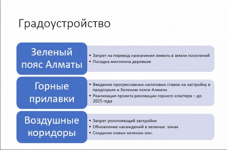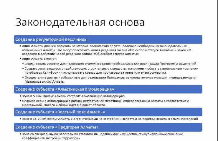 "Предгорья Алматы" - это зона со специальными налоговыми ставками на недвижимое имущество, стимулирующая снижение количества застройки", - пояснил он.