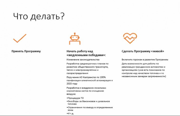 "Ситуация становится все хуже. Первый, второй, третий аким принимают программы, но ничего не происходит. Получается, что власти могут меняться, акима могут забрать на повышение, а город останется, и поэтому мы решили, что горожане сами должны написать эту программу. Гражданское общество должно контролировать этот процесс, а выполнение должно быть при любом акиме", - заявил он.