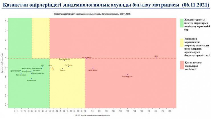 В "красной" зоне матрицы оценки эпидемиологической ситуации находятся: Костанайская, Павлодарская, Акмолинская, Северо-Казахстанская области.