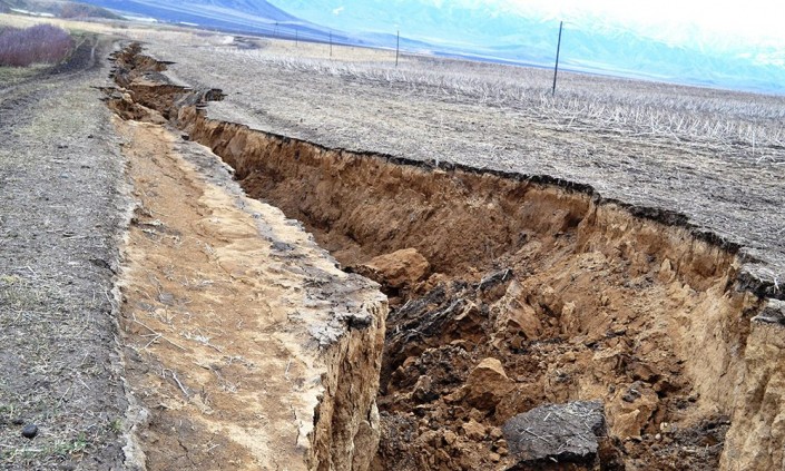Огромная водомоина, напоминающая геологический разлом, образовалась на месте полевой дороги в результате интенсивного таяния снега на участке Караозек в Солоновском сельском округе Катон-Карагайского района ВКО, пишет altaynews.kz.