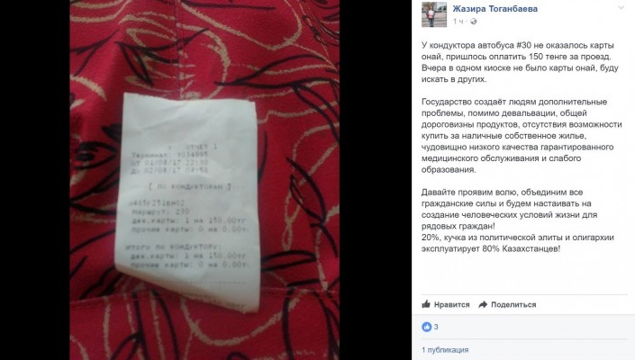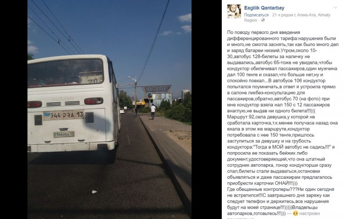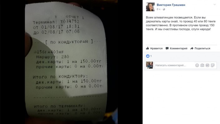 В свою очередь, алматинцы в Facebook пишут, что водители продолжают вместо билетов давать пассажирам отчеты при оплате наличными, либо вовсе не дают их.