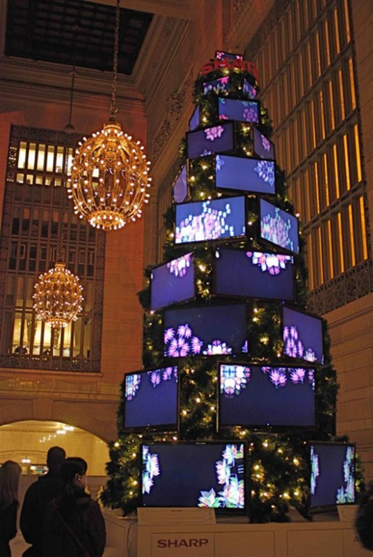 Среди новогоднего креатива встречаются и такие варианты. Из десятков телевизионных мониторов в одном из торговых центров установили елку для киноманов.